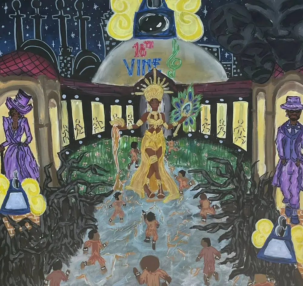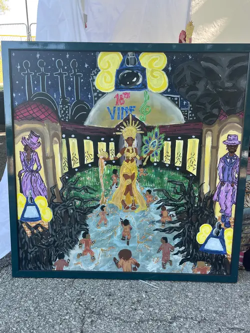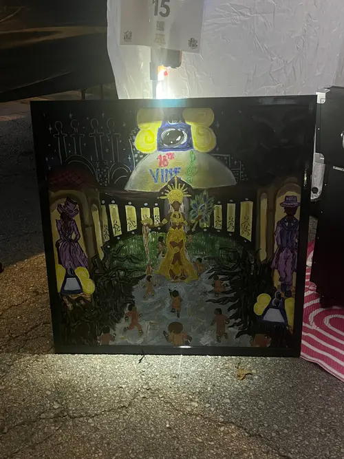 This artwork embodies the spirit of creative liberation for the Black community in Kansas City, Missouri. It vividly depicts a slaves making a daring escape across a frozen expanse of water, symbolizing the struggle for freedom and the quest for self-expression. In this powerful imagery, the African goddess stands as a beacon of hope, opening a portal that leads to the vibrant 18th & Vine jazz district. This historic area, rich in cultural significance, becomes a transformative space where individuals can embrace their identities and flourish as the queens and kings of dandyism. Here, they are free to explore and express their creativity in its fullest form, celebrating their heritage and the artistic legacy that continues to thrive in the heart of the city.