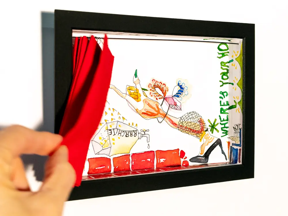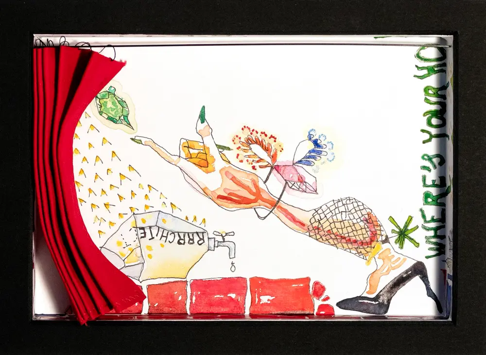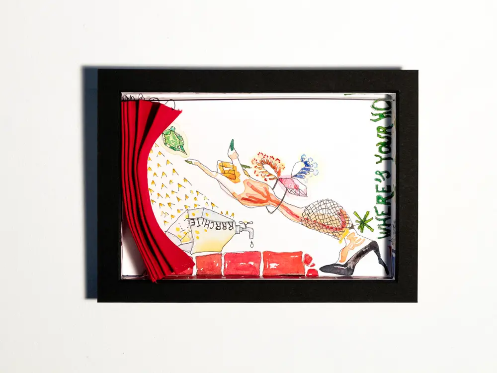 Ink thin-liner and watercolor on gesso, cardboard, carbon rod, thread, fabric. Se Abre El Telón opens the theater curtain, granting us a glimpse into a world full of surrealist narratives. Lightly drawn, this work reflects, with fine irony, the poetic world of Alicia Velázquez. Her intricately woven drawings engage us with contemporary issues in a way that encourages reflection with lightness. The artist's imaginative world interweaving fantasy and reality touches us on various levels, inviting the viewer to interpret it in their own way.