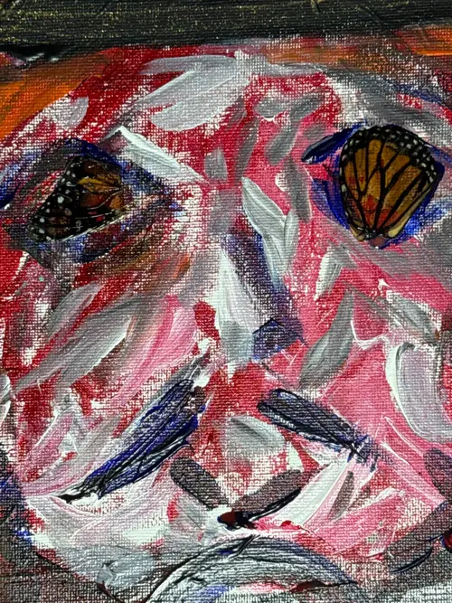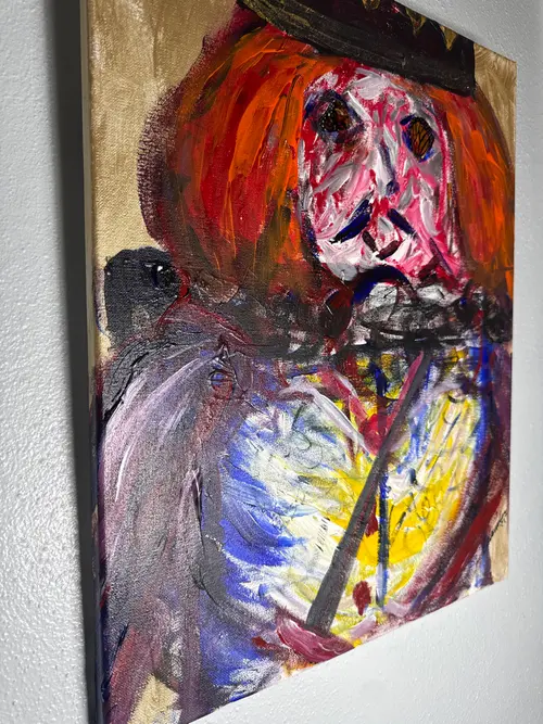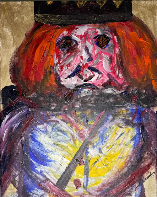 A bold original. A crowned clown whose monarch-butterfly eyes show destruction of beauty for his own gain. Vibrant reds, golds, and electric blues swirl across the canvas, blending royal power with whimsical melancholy. Perfect for collectors who crave art that feels alive with emotion and hidden meaning.