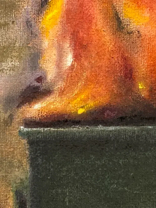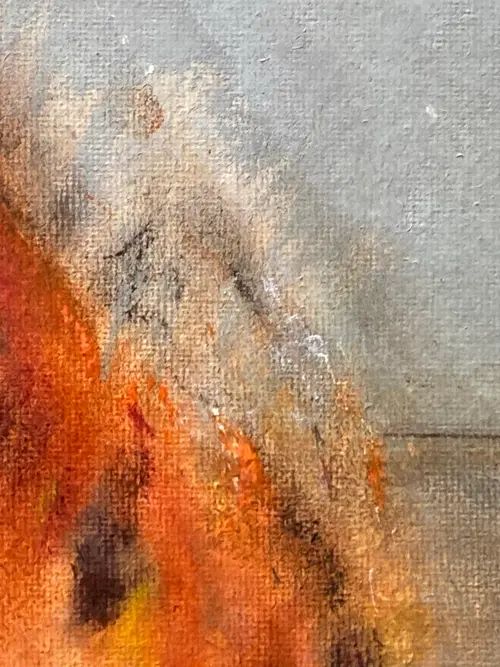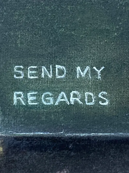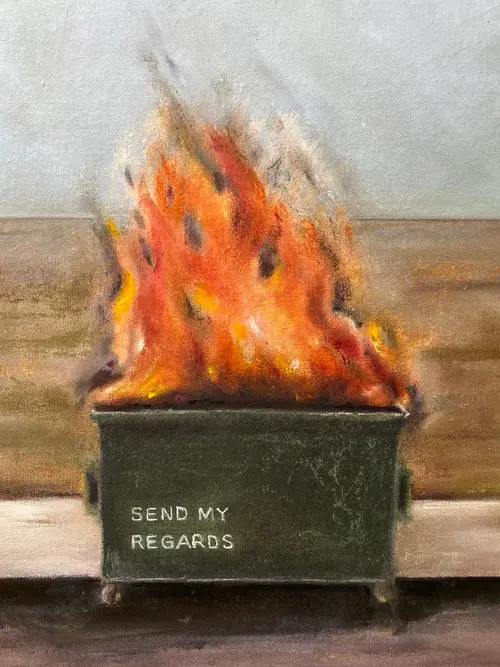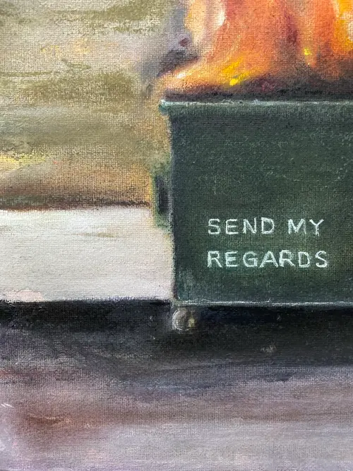 Send My Regards Acrylic & pastel on canvas panel 30 × 40 cm A green metal bin sits in a quiet, empty landscape. It is on fire. Painted across its front, in neat white letters, are the words Send My Regards. This work plays with restraint and release—polite language meeting a moment of absolute combustion. The flames are expressive and physical, built with layered pastel and loose acrylic marks, while the surrounding space remains calm and sparse. The horizon is flat, the sky pale, the world indifferent. It reads like a postcard from the end of something: a relationship, a season, a version of yourself. The message is dry, almost courteous, but the scene is anything but. Send My Regards is about the quiet satisfaction of letting go, the poetry of understatement, and the beauty of destruction rendered tenderly. It balances humour with melancholy—an elegant goodbye written in smoke. Original, one-of-a-kind artwork. Signed on the back. Unframed. This painting is varnished and can be framed with or without glass.
