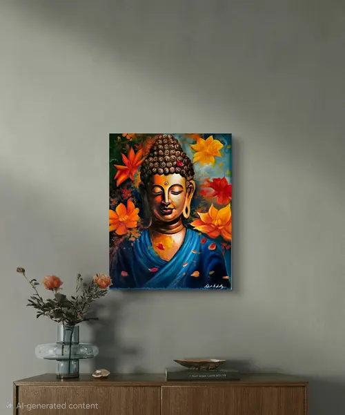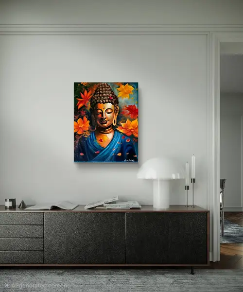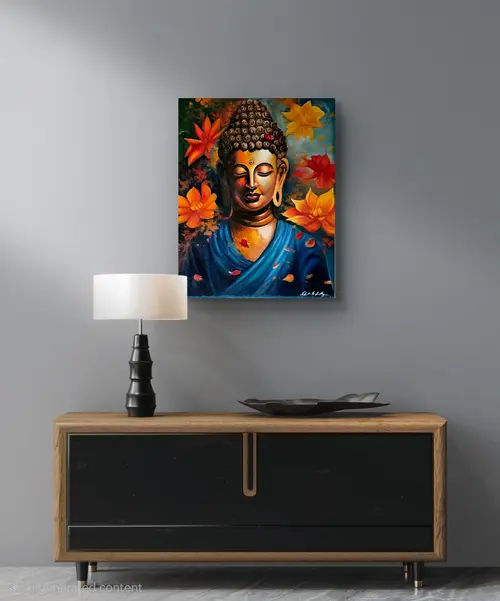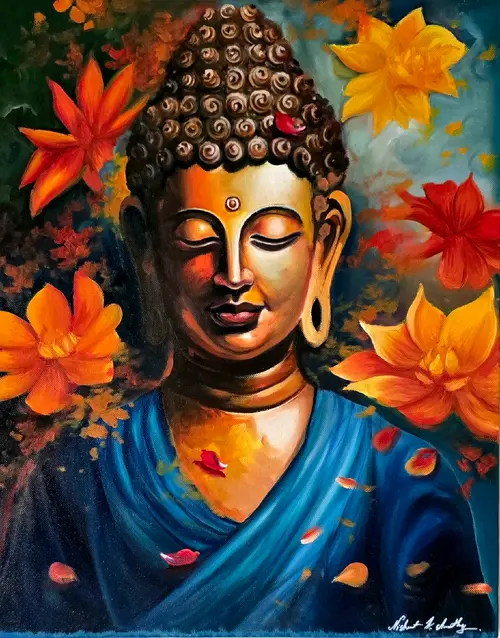 "Serenity in Bloom" is an oil painting on stretched canvas, measuring 16 x 20 inches and completed in September 2025. The work features a meditative Buddha enveloped by vivid autumn flowers, each petal bursting with color against the tranquil blue of the figure’s robes. The composition’s rich hues reflect Buddhist symbolism: blue is often linked to wisdom and healing, while red and gold evoke compassion and enlightenment.Central to the painting is the Buddha’s calm presence—his half-closed eyes and composed expression foster a sense of introspective peace and mindfulness. Surrounding him, the vibrant blossoms symbolize purity, spiritual awakening, and the cycles of renewal that life undergoes. The interplay of vivid floral colors with the serene central figure creates harmony, suggesting that true tranquility is not isolated from life’s brightness, but nourished by it.Texture and light play a crucial role in this work; the layering of oil paint brings depth to the Buddha’s robes and dimensionality to the petals. The painting channels traditional spiritual themes with a contemporary energy, making it both a calming focal point and a celebration of life’s exuberance—perfect for viewers seeking reflection and vibrancy in their surroundings