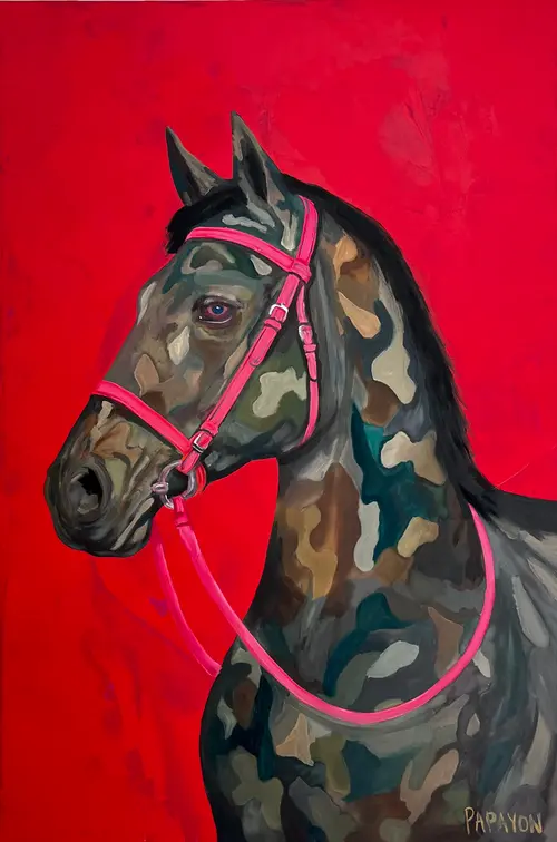 A steed dressed in camouflage stands still, alert—every muscle trained for silence, for war. Yet the bright pink bridle speaks louder than any battle cry. It’s not decoration; it’s declaration. In the language of war, this is a signal: bold, defiant, impossible to ignore. This painting speaks of control and contrast—obedience wrapped in individuality, strength under constraint, and how even the most disciplined force can carry a touch of rebellion.