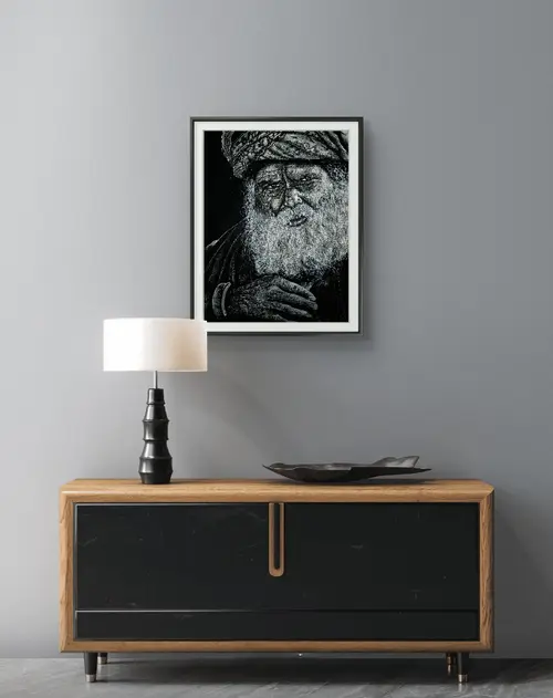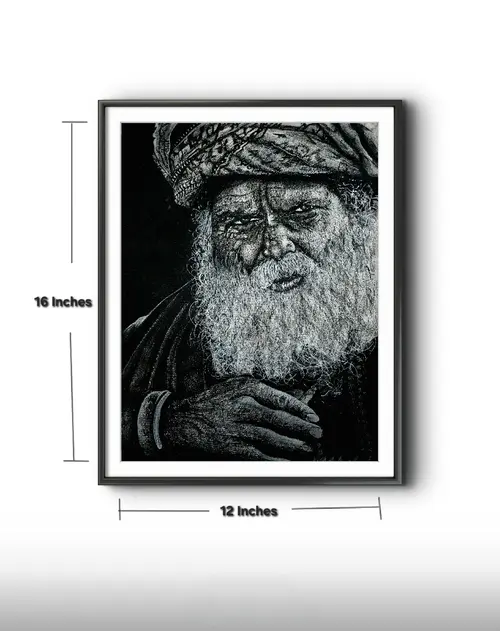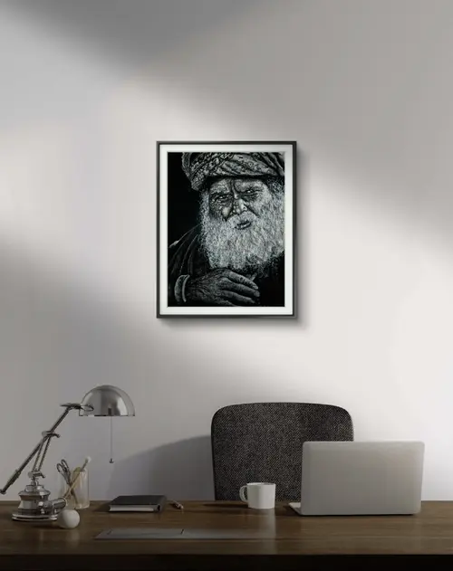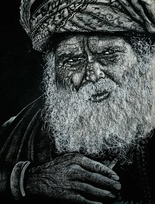 This work presents a monochromatic portrait executed in ink, emphasizing detailed line work and tonal contrast. The subject's expression and physical textures-particularly the beard, skin, and hands-are rendered with precision to convey a sense of lived experience. The composition isolates the figure against a dark background, directing focus toward the face and creating a strong visual presence. The piece reflects on themes of time, resilience, and human depth, balancing realism with expressive mark-making.
