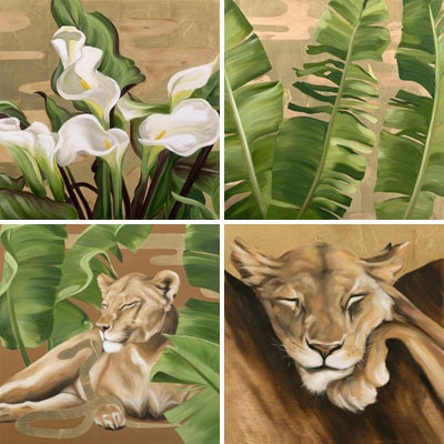 Hello! I’m a self-taught artist based in in Toronto. My paintings are inspired by magic in the natural world, featuring slumbering animals and lush plants set in golden light. I paint on locally made wood panels, layering oils and metal leaf over exposed wood grain to achieve organic scenes with lots of movement. A hiker and former archaeologist, I look to wild plants, antique treasures, and sleepy house cats for colours and compositions that speak to me. My recent series Golden Hour (2023) and Ephemeral (2024) invite rest and indulgence, referencing feminine figures in Art Nouveau, the rich warmth of Klimt's Golden Phase, and the mysticism of Pre-Raphaelite dream scenes. I hope this imagery will evoke for viewers the rich warmth and energy of golden hour, that fleeting time of day when the sun casts its most magical spell. ✨