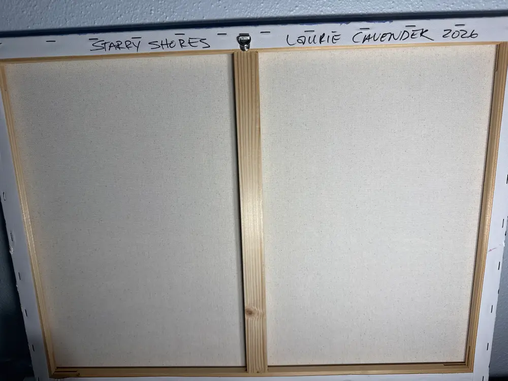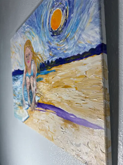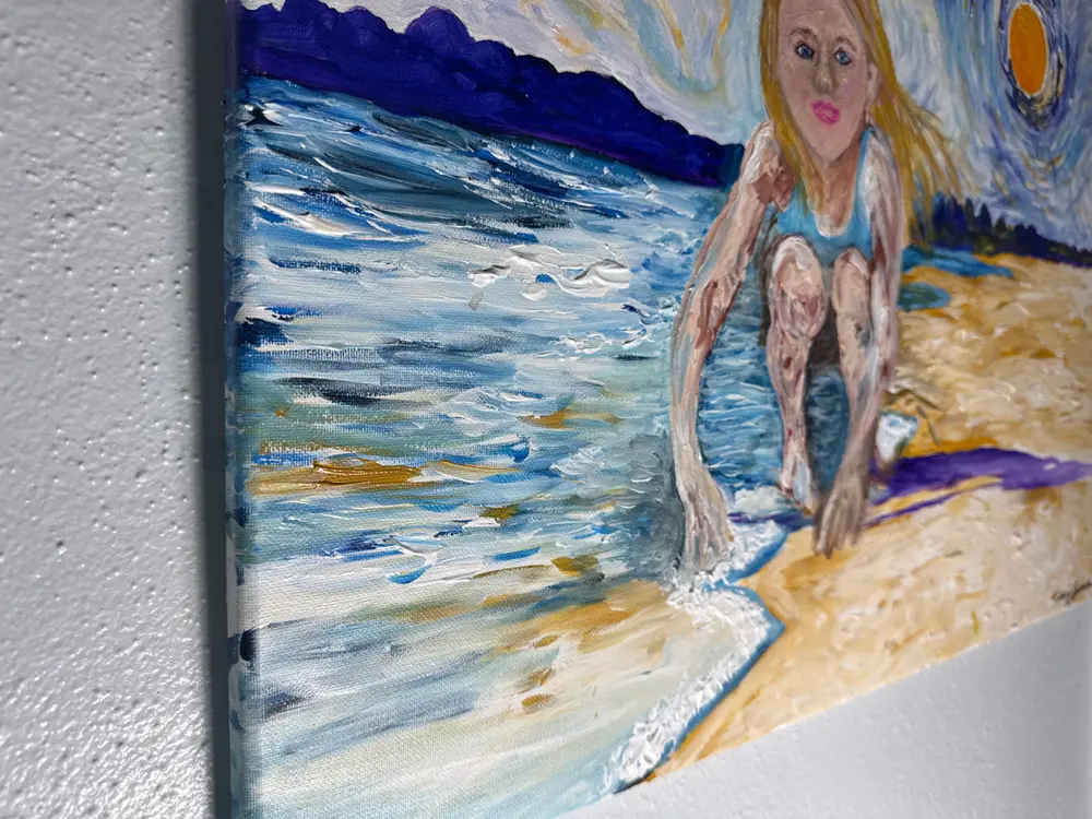 Immerse yourself in the swirling magic of “Starry Shores,” an original painting by Laurie Cavender that masterfully blends the emotional intensity of Van Gogh with the serene beauty of a Florida coastline. A young girl crouches at the water’s edge, her thoughtful gaze and wind-tossed golden hair capturing a moment of quiet wonder as the tide gently laps at her feet. Above her, the sky explodes in dynamic, swirling brushstrokes of deep blues, vibrant yellows, and radiant golds, with a luminous sun or moon radiating energy like a celestial beacon. The distant tree line anchors the scene in peaceful reality while the expressive, textured impasto brings the entire composition to life with movement and feeling.