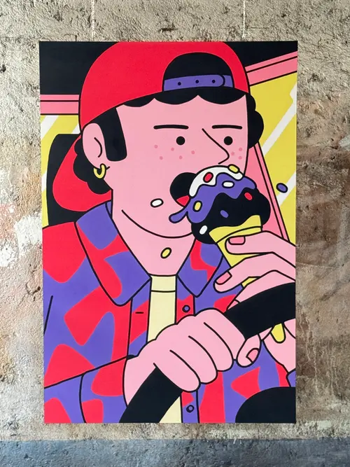 SUGAR RUSH, the present moment. Between the joy of an ice cream and a summer drive, this work captures the pure pleasure of the here and now, a sweet and ephemeral instant to be consumed immediately.