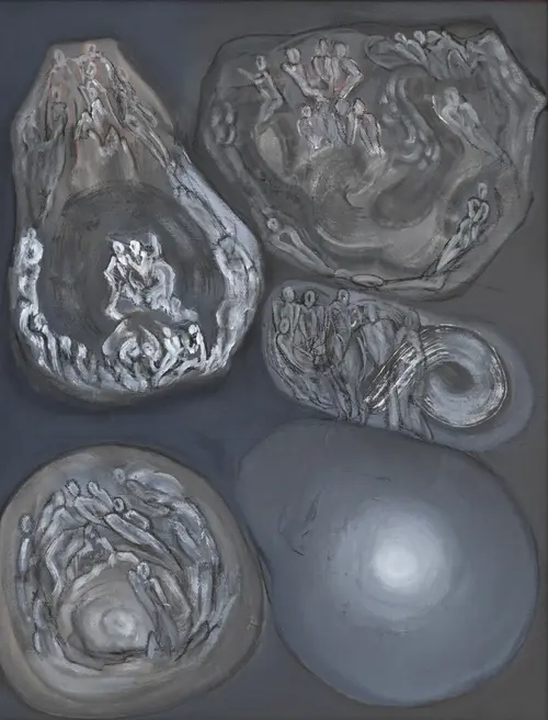 the Four Noble Truths, 2025. Rehydrated acrylic, India ink and conte on upcycled canvas. the first of the Buddha’s teachings offered to his disciples are usually cited as the Four Noble Truths (Sanskrit: catvāryāryasatyāni), believed by the Buddha to be the foundation to life and vital to believe in order to access enlightenment. These truths are firstly unease, the impermanence of mortal life and the inevitability of suffering (sukha), a subsequent longing for and attachment to this impermanence and suffering (samudaya), cessating of suffering through containing or severing attachment desires (nirodha) which ushers the truth-seer towards the the eightfold path (marga) followed to cessate attachment and subsequently release oneself from suffering. A practicing Buddhist for nine years, Mikell painted this work in an effort to visualise her personal relationship to these truths, while intending to make space for how other Buddhists might relate to them both in their own religious practices and in their lives broadly. consistent with Mikell’s practice, this piece is composed entirely of repurposed materials diverted from cycles of disuse, in an effort to mitigate industry waste. As a result, imperfections to the surfaces of frames and canvases are to be expected. Please contact the artist with further inquiries about production. PLEASE NOTE——all prices are in CAD.