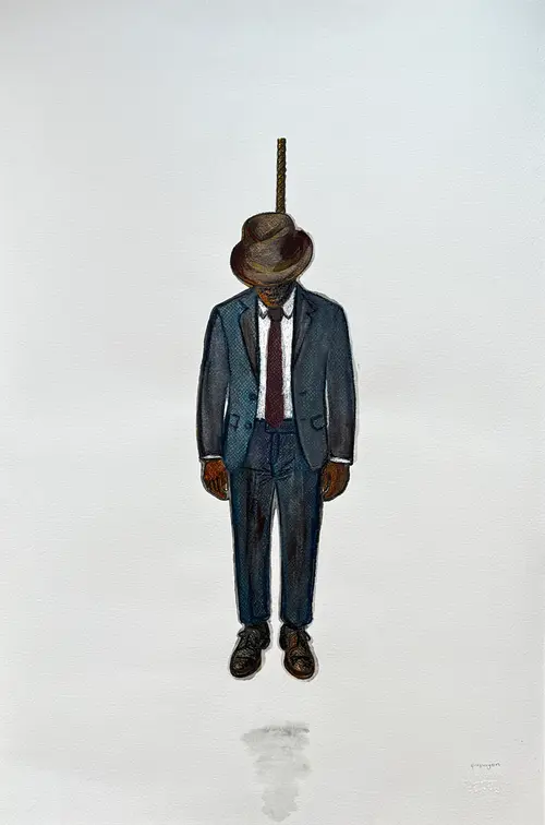 Dressed sharp, with polished shoes and a tired tie, this figure in The Hanging Man series represents the salesman — not just in trade, but in life. The man who pitches, pleases, persuades. The one who always has to smile first. Here he hangs, not for failure, but for having to perform too long. For becoming the product himself. The suit no longer sells. The hat doesn’t charm. The silence now speaks. He was always closing… until he couldn’t anymore.