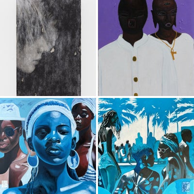 Jay Golding’s figurative paintings and drawings evoke mythology, migration, and interconnectedness, creating literal and symbolic layers employed by vibrant palettes in acrylics and oils, sometimes incorporating collaged or impastoed elements. Golding’s emphasis on tribal cultures within his work, often infuses Caribbean and African cultural motifs allowing him to draw parallels between various communities–expressed by his masked figures and other fictional characters such as the purple-skinned beings from the village “Maji ya bluu”, which is Swahili for blue water. Golding frequently signs his work under the pseudonym Kwame, a name he donned after visiting Ghana in 2019 with his family. He cites his trip to the West African nation as well as Mexico as being life changing and having profound effects on his work.