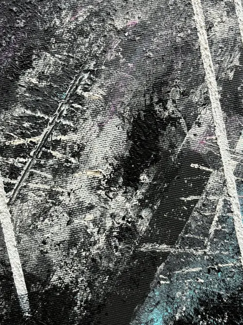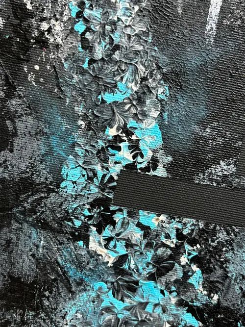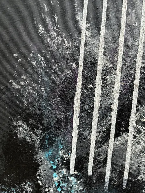 ▪️⚫️"The Uncertainty of Thoughts" is a thought-provoking and introspective piece that delves into the complexity of the human mind. The white, elongated lines symbolize our thoughts, constantly shifting and varying in length, never fully punctual or certain. Yet, there are also stitches present, representing the hidden memories and forces of our subconscious that weigh upon us and influence our actions without our conscious awareness. .00.0010 ⚫️▪️This painting serves as a reminder of the power and influence our innermost thoughts and buried memories hold over us, guiding our daily lives and shaping our experiences. It is a visual representation of the intricate and often uncertain nature of our thoughts and the impact they have on our existence.⚫️▪️