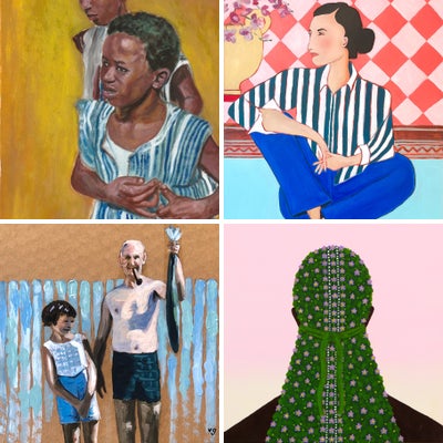 Jay Golding’s figurative paintings and drawings evoke mythology, migration, and interconnectedness, creating literal and symbolic layers employed by vibrant palettes in acrylics and oils, sometimes incorporating collaged or impastoed elements. Golding’s emphasis on tribal cultures within his work, often infuses Caribbean and African cultural motifs allowing him to draw parallels between various communities–expressed by his masked figures and other fictional characters such as the purple-skinned beings from the village “Maji ya bluu”, which is Swahili for blue water. Golding frequently signs his work under the pseudonym Kwame, a name he donned after visiting Ghana in 2019 with his family. He cites his trip to the West African nation as well as Mexico as being life changing and having profound effects on his work.