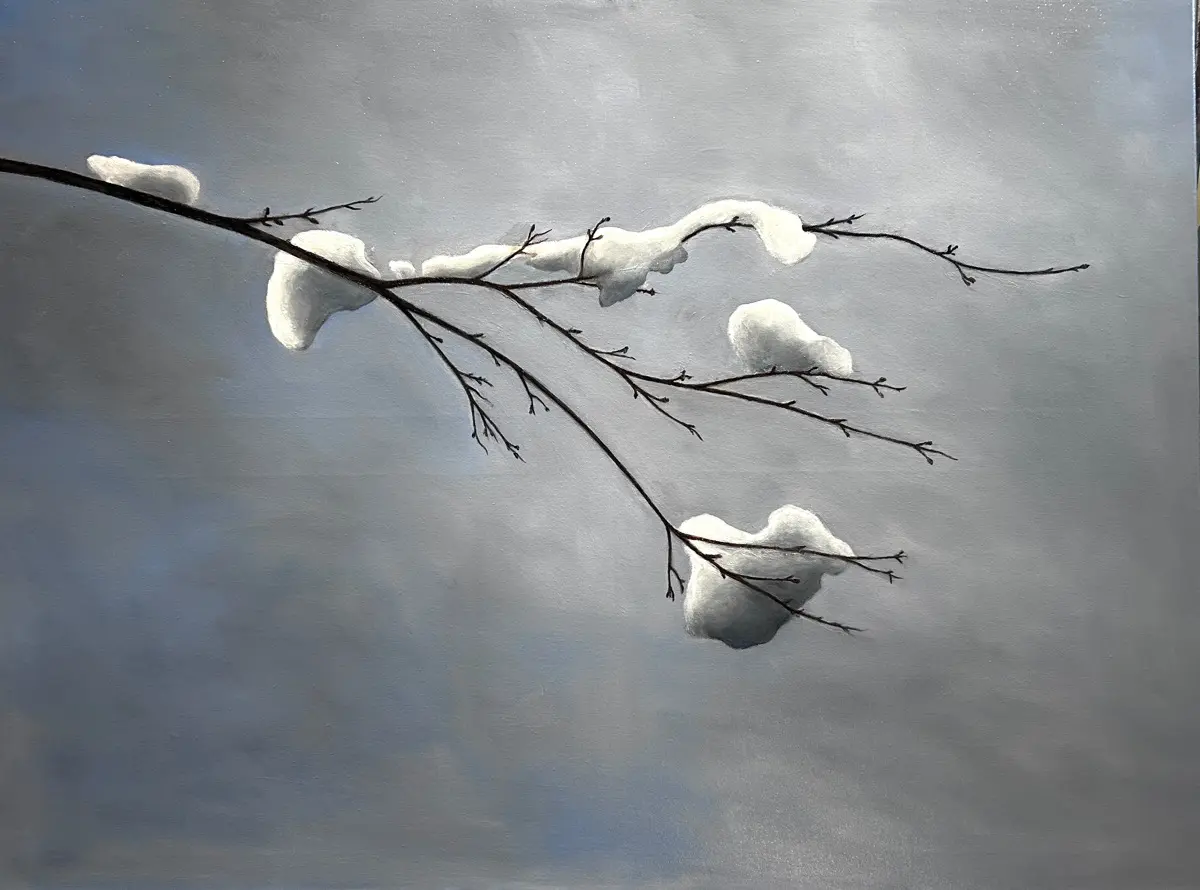The delicate balance and intricacy of the branch & snow with a background suggesting infinite space creates a sense of the state of Grace.