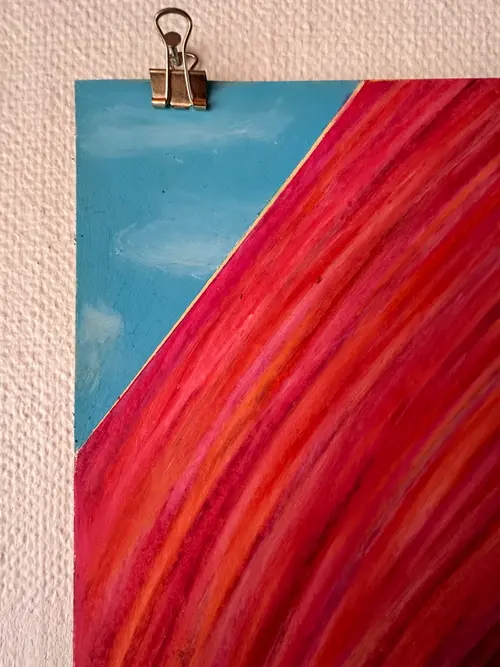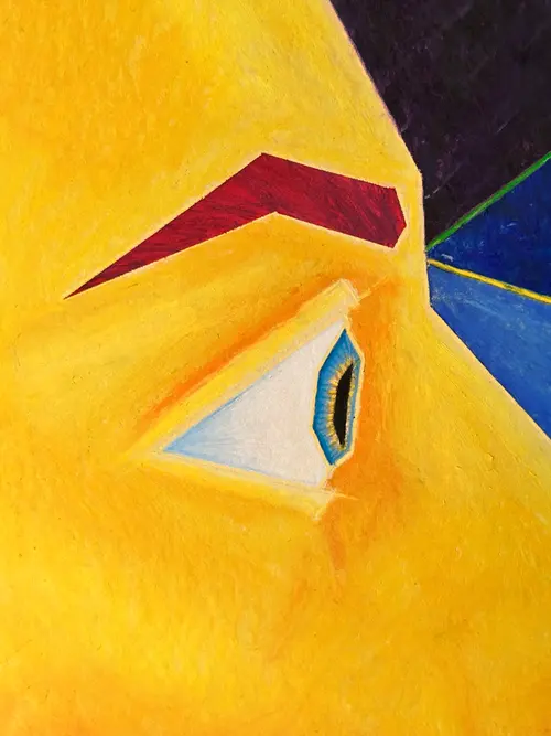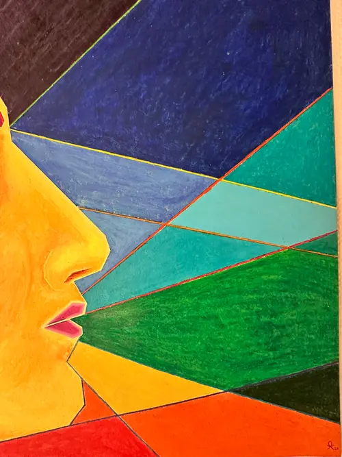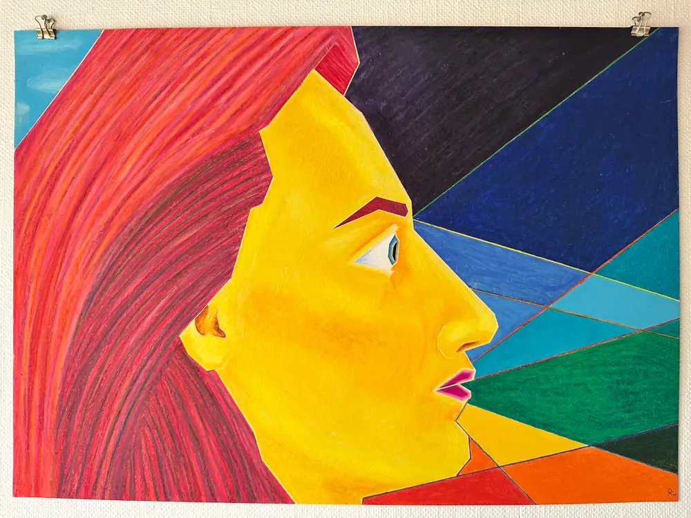 Oil pastel on thick paper. Tissue and colors, inside controlled lines.