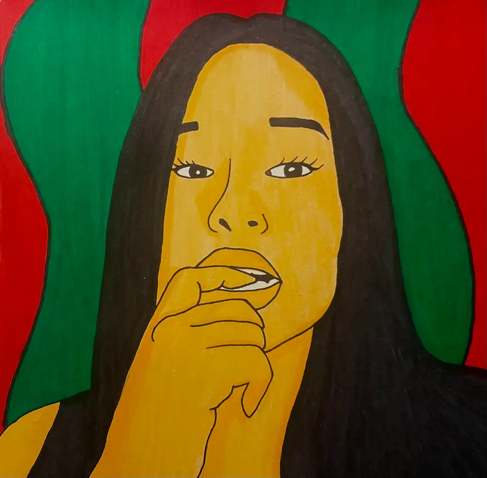 This portrait shows a girl in front of green and red waves in water-based marker and Sharpie.