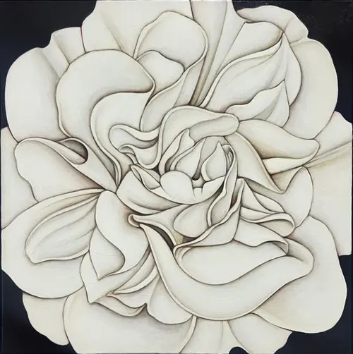 White Camellia at Night is part of a new collection of pieces from my Nocturnal Series, exploring nature in urban settings in an age of 24 hour cities. White Camellia at Night is a study on natural life in the darkness, in particular in a city where light pollution and dense populations means we rarely ever experience a true absence of light. I studied the camellias in my neighbourhood to see how they emerged from the dark surroundings like miniature sculptures against dense foliage, reflecting brightly under street lighting even late at night. I experimented with combinations of crimson and vert de gris pigments through this piece, both to form the shadows and definition in the flower, and to create the depth and fullness of the background. The piece is finished with a black wooden frame, ready to hang.