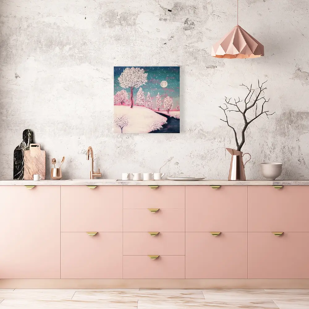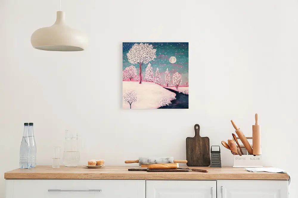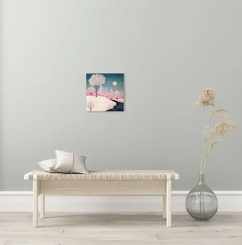 Snow Laden trees stand against an evening sky. The full moon illuminates the twilight and a rosy glow suffuses this romantic winter scene with the last rays of a sun that has disappeared beyond the horizon. "Winter Moon" is a small and charming landscape painting that captures the magic of a winter evening. The artist's impressionistic style evokes a sense of whimsy, while the blue, white, and pink hues create a romantic and peaceful mood. The sides are painted white, and the canvas arrives ready to hang. Perfect for adding a touch of warmth to any space, this piece would be lovely in a bedroom, living room, or entryway. Its compact size makes it ideal for creating a gallery wall or displaying on a shelf. Let this artwork bring the beauty of a starlit, snowy night into your home.