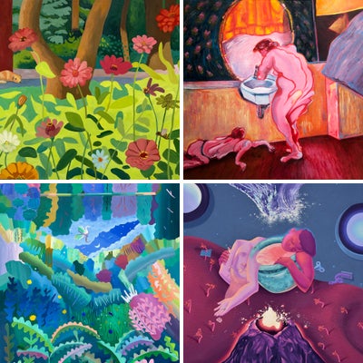The process begins with pencil sketches of memories that reveal degrees of the absurdity, humor or tenderness. Animals and water are among the imagery used to express fear, surprise, love and winning.